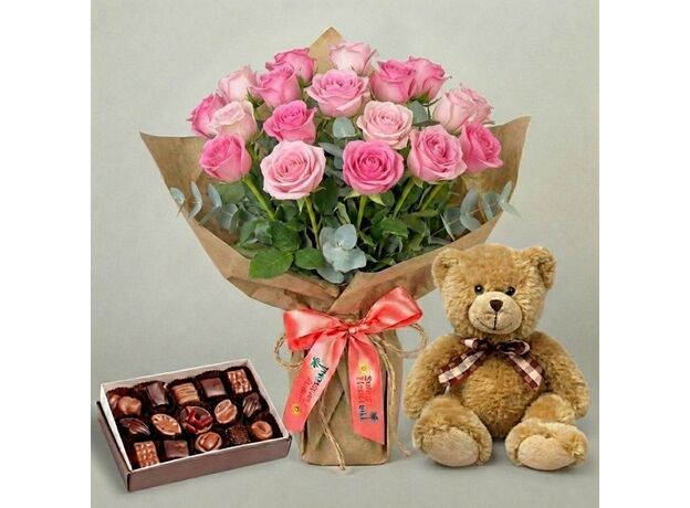 Twenty pink roses in a hand-tied bunch with a teddy bear and a box of chocolates. This is the largest and most expensive gift combo in the collection. Everything we sell with a bear or chocolates or both is a variation on the same idea: cover more ground with one delivery. This product covers the most ground of all. Our thirty-first most popular across Bali and number one to BIMC Hospital.