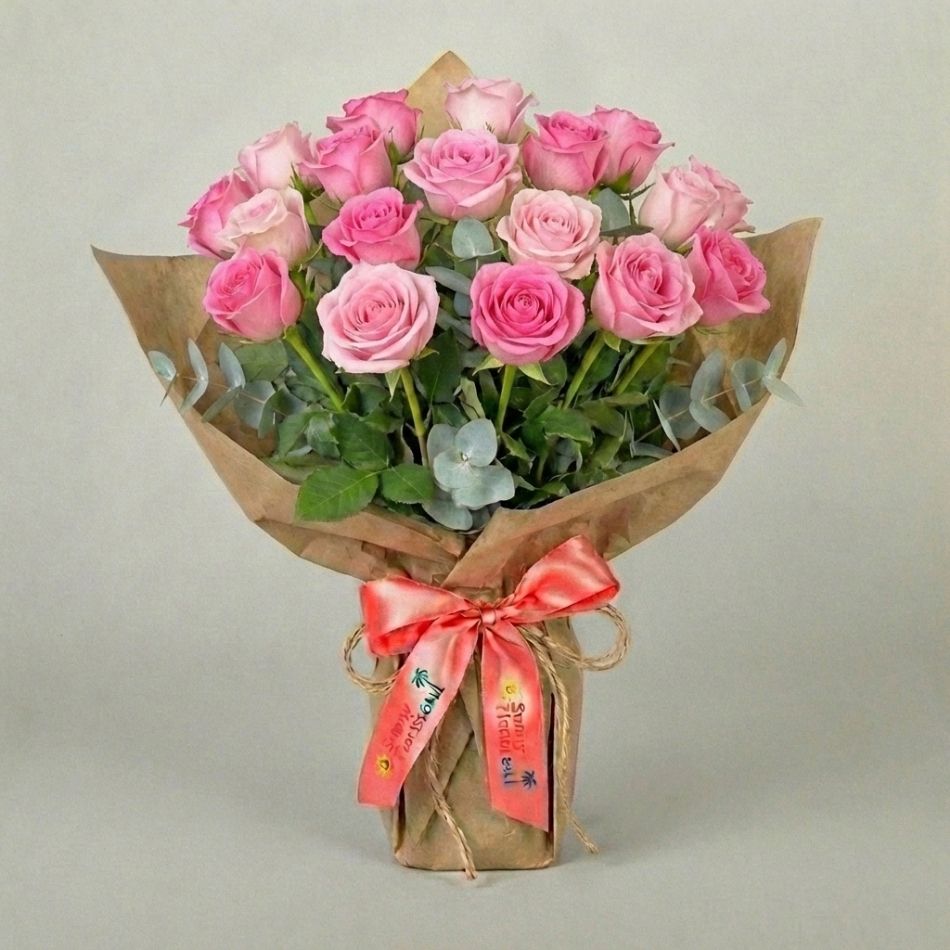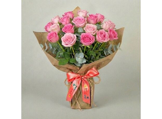 Twenty pink roses in a hand-tied bunch. No chocolates. No teddy bear. No wrapping. No vase. Just twenty roses and foliage, stems gathered in a spiral, delivered as a bunch. At $50 this is the most roses per dollar in the entire collection and the only twenty-stem product that arrives as nothing except flowers. Sixteenth most popular across all of Bali, third to Kerobokan.