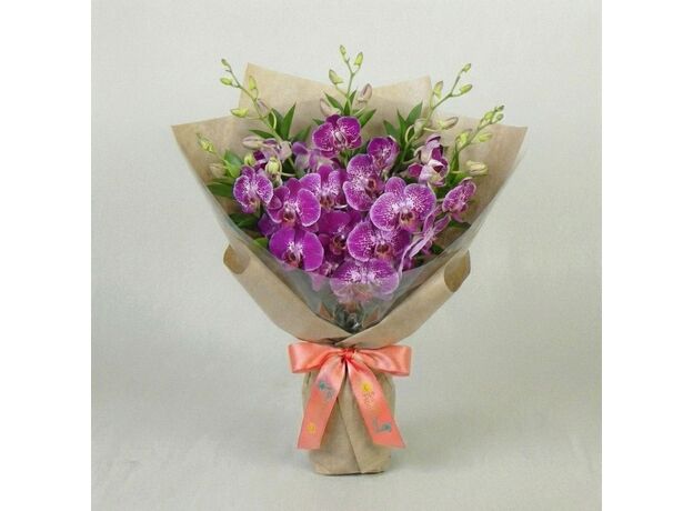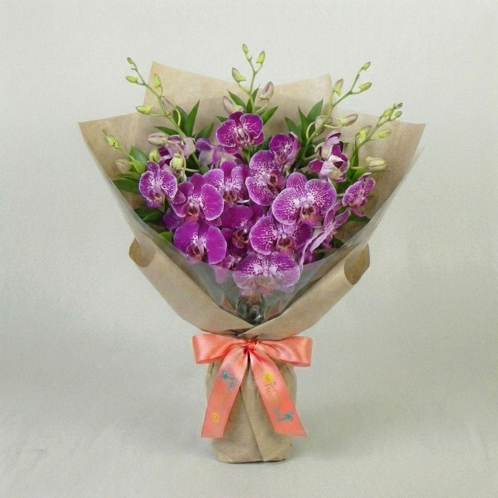 Multiple stems of bicolour dendrobium orchids wrapped in purple sheer mesh with a satin ribbon at one end. The blooms are white at the centre and deepen to magenta at the petal tips. The bunch is presented in a horizontal sheaf, not an upright bouquet, so the full spread of flowers is visible the moment the wrap comes off. This is the only orchid-only product in the entire collection. No roses. No filler. No padding. Fifty-seventh most popular across all of Bali.