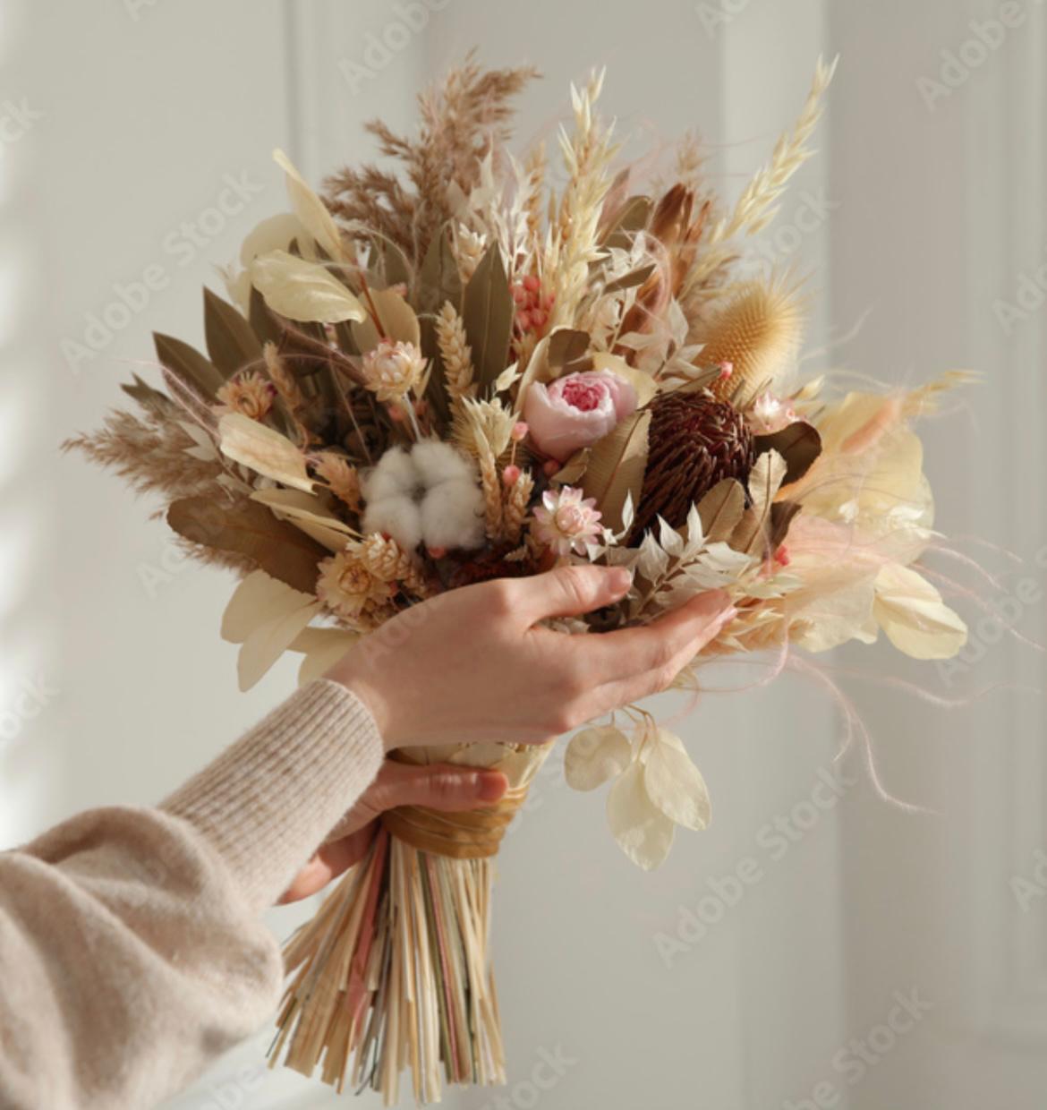A stunning dried flower bouquet that exudes rustic elegance and natural beauty. Meticulously crafted by skilled Bali florists, this one-of-a-kind arrangement features a harmonious blend of soft pinks, warm browns, and golden hues. Textural elements like cotton, wheat, and various dried flowers and seed heads create a captivating visual tapestry.