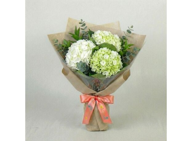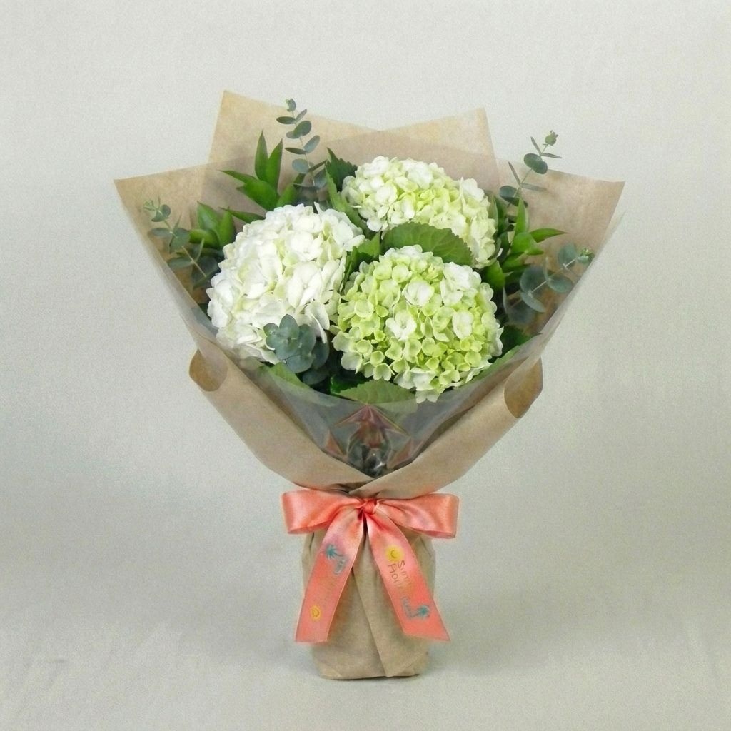 $40.00 USD. Same day delivery, seven days a week, across all Bali locations including Kuta, Nusa Dua, Berawa, Denpasar and beyond. Green and white mophead hydrangeas, hand-tied bunch.