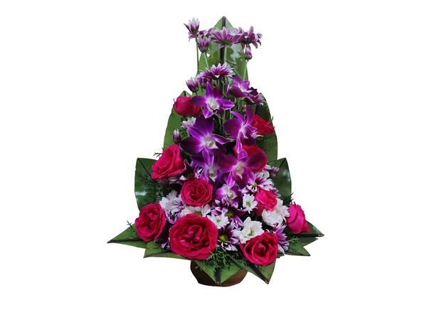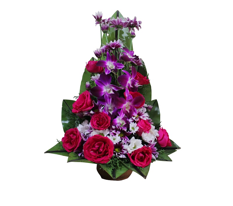 Send a message of love with our bouquet of red roses, purple Singapore orchids, purple chrysanthemums, and white daisy chrysanthemum, accented with lush tropical foliage.