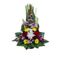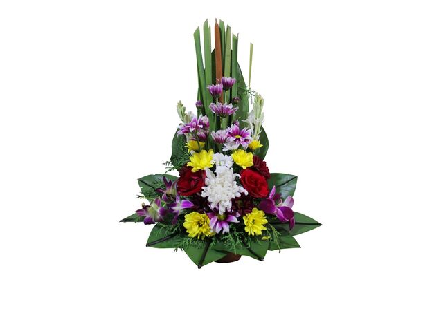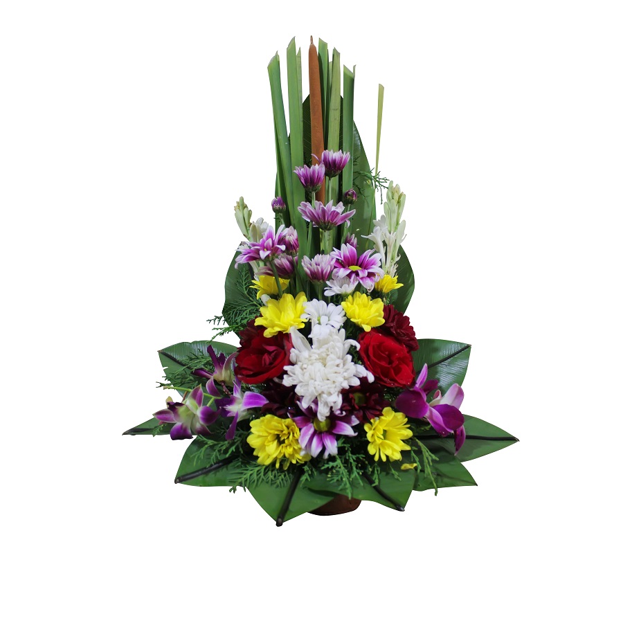 Here’s a quick way to back up that feeling of profound joy, by sending our celebratory keepsake vase arrangement of Yellow Chrysanthemums, Red roses, White Disbuds, Purple Orchids, Purple Chrysanthemums, Cat Tails, highlighted with Tropical Grass and Greenery.