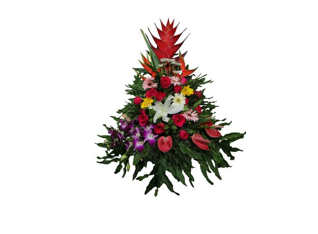 And you will be too when you order this beautiful arrangement of red Roses, Ginger, Heliconias, purple Orchids, red Anthuriums, Gerberas, Daisy Chrysanthemums.
